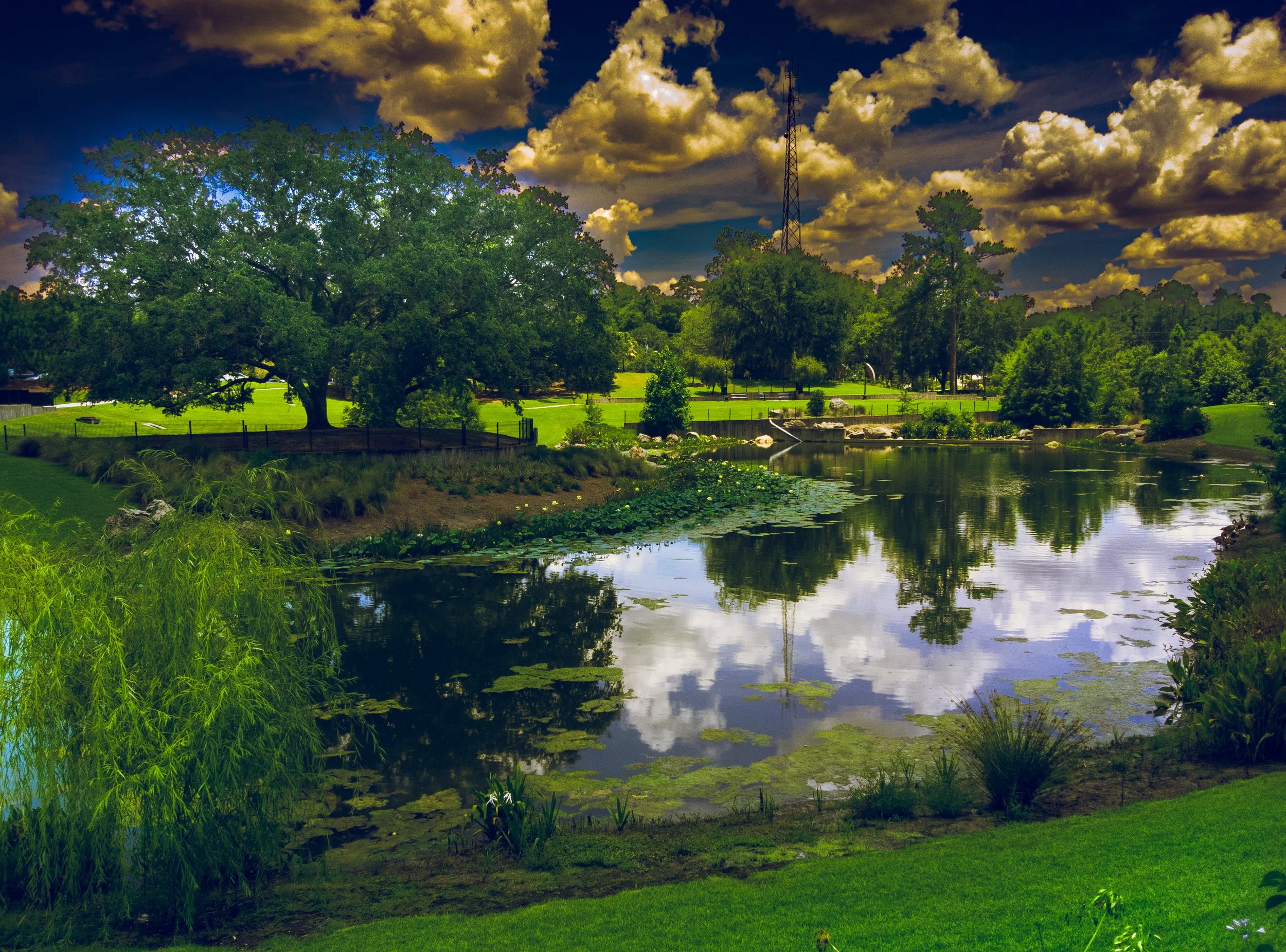The photo below beautifully depicts a vibrant sunset casting its glow over a serene lake, nestled amid lush greenery. While you can’t see them, there were actually a whole bunch of bugs present. The warm and inviting colors evoke feelings of calm and tranquility.